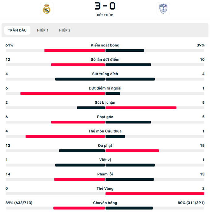 Real Madrid đã thể hiện đẳng cấp của mình sau 37 phút thi đấu, ghi bàn bằng cú sút trúng đích đầu tiên của trận đấu. Vinicius Junior đón đường chuyền tuyệt vời của Jude Bellingham trước khi vượt qua Carlos Moreno và thoải mái chuyền bóng ngang cho Kylian Mbappe, người đã đệm bóng vào lưới trống từ cự ly gần ghi bàn duy nhất của hiệp một.