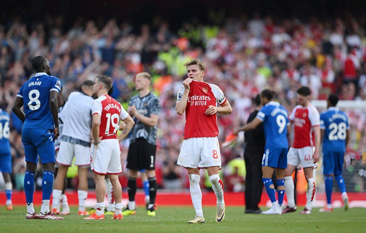 Arsenal nhanh chóng đẩy cao đội hình lên tấn công và uy hiếp khung thành Everton. Nhưng khi biết tin Man City sớm dẫn trước West Ham ở trận cùng giờ, các học trò của HLV Mikel Arteta dường như đã bị ảnh hưởng về mặt tâm lý.