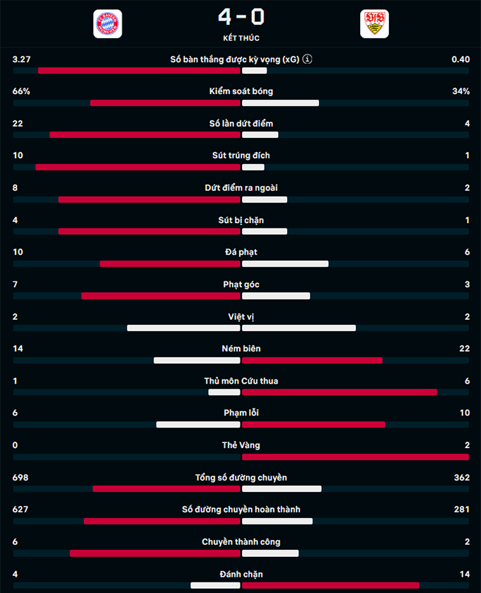 Bước sang hiệp 2, Bayern Munich gia tăng sức ép nhưng vẫn vấp phải hàng phòng ngự chắc chắn của Stuttgart. Mãi đến phút 57, khác biệt mới xuất hiện khi Harry Kane dứt điểm căng từ ngoài vòng cấm, bóng đi đập đất khiến thủ môn Nubel bó tay. 1-0 cho Bayern.