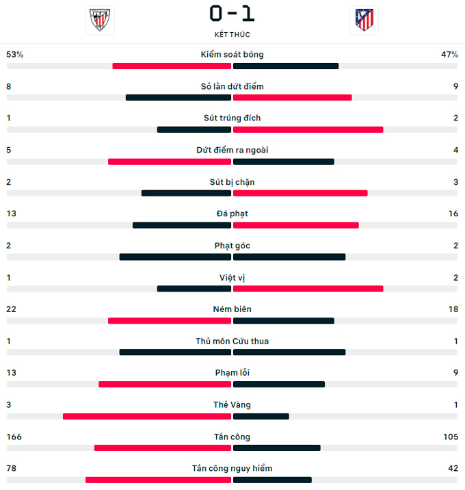 Sang hiệp 2, hai đội liên tục có những tình huống ăn miếng trả miếng song tất cả chỉ dừng lại ở mức cơ hội. Những tưởng hai đội sẽ chia điểm thì phút 90+2, Atletico tận dụng rất tốt sai lầm của hậu vệ Bilbao để phản công thần tốc.