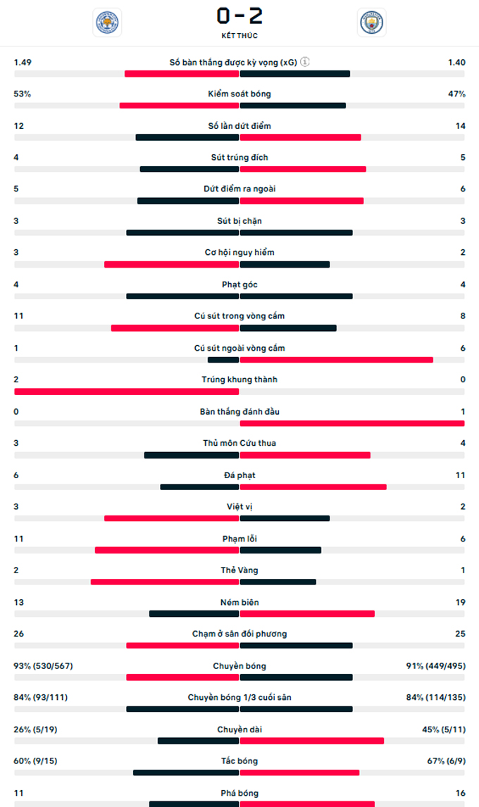 Leicester đã cố gắng thay đổi với những sự điều chỉnh nhân sự của HLV Ruud van Nistelrooy, nhưng các cơ hội tốt nhất của họ, chỉ là cú đánh đầu dội xà ngang của Jamie Vardy ở phút 90. Trận đấu khép lại với chiến thắng 2-0 dành cho Man City.