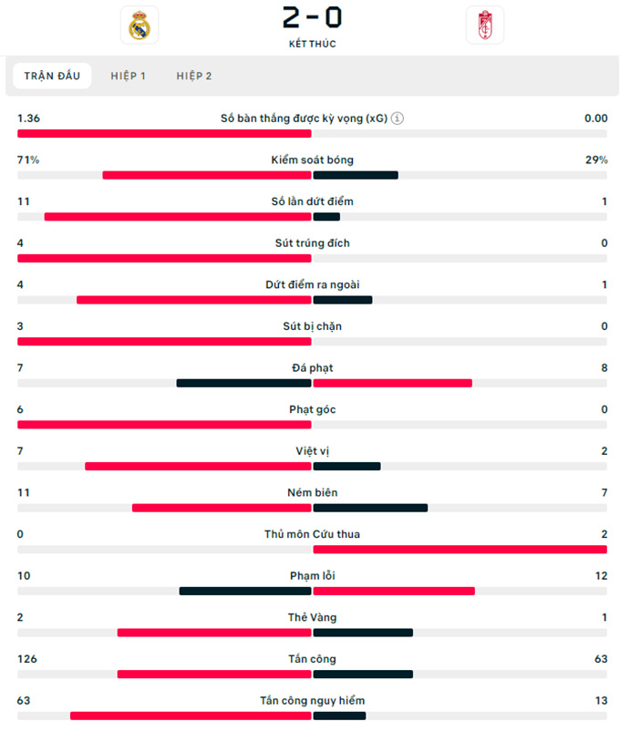 Mặc dù Bellingham không tỏa sáng như thường lệ, nhưng NHM Real Madrid cũng không quá lo lắng, khi Los Blancos đã có một trận đấu áp đảo hoàn toàn đối thủ. Tỷ lệ kiểm soát bóng của đội chủ nhà luôn ở ngưỡng xấp xỉ 70%, đồng thời không cho đối thủ có nhiều cơ hội để hướng trái bóng về phía khung thành thủ môn Andriy Lunin. Thống kê cho thấy, trong cả trận đấu Granada không có nổi một cú dứt điểm trúng khung thành.