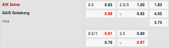 Tuy phong độ và vị thế kém hơn đối phương nhưng AIK Solna vẫn chấp dao động giữa mức hòa và 3/4. Kèo như vậy trong bối cảnh hiện tại là khả quan hơn với chủ. GAIS có tâm lý không tốt khi xa nhà và họ toàn thua 4 trận sân khách vừa qua.
