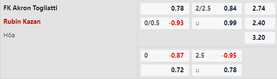 Kèo chấp 1/4 nhưng có điểm bỏ sâu, đó chưa phải mức handicap khả quan dành cho Rubin Kazan trận này. Trong khi đó, Akron Togliatti đáng tin hơn với 2 trận thắng theo châu Á gần đây, còn Rubin Kazan 3 trận liền chỉ hòa và thua.