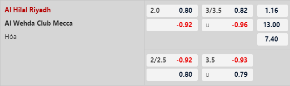 Sàn giao dịch châu Á ghi nhận mức kèo Al-Hilal chấp 0:2, tỷ lệ mà ở trận đối đầu gần nhất xuất hiện họ đã bị Al-Wehda cầm hòa. Tính xa hơn, Al-Hilal để thua kèo ở 4/5 trận đối đầu gần nhất. Sẽ là một trận đấu mà đội đầu bảng giành chiến thắng, nhưng sẽ khó có thể thắng cách biệt trên 2 bàn ở màn so tài này.