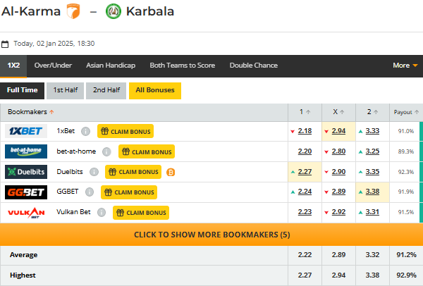 Thông tin tỷ lệ Al Karma vs Karbalaa: