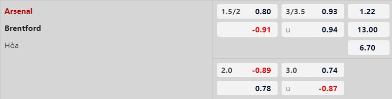 Lần tiếp Brentford trên sân nhà gần nhất, Arsenal chấp có 1 hòa nhưng trận này, kèo cao hơn nhiều với mức tới 0:1 3/4.