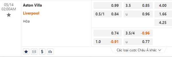 Thông tin tỷ lệ kèo bóng đá Aston Villa vs Liverpool: