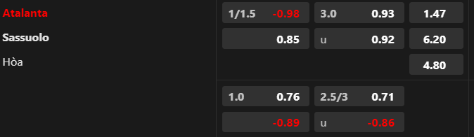 Atalanta đang nhận được niềm tin trong trận đấu này. Tỷ lệ chấp của đội bóng thành Bergamo đã tăng từ -3/4 lên -1 1/4 (tính tới sáng 3/1). Dù sao, Atalanta xứng đáng được tin tưởng khi thi đấu cực tốt trên sân nhà. Atalanta cũng giành chiến thắng trong 7/10 trận gần nhất gặp Sassuolo.