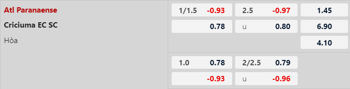 Thông tin tỷ lệ Atletico Paranaense vs Criciuma: