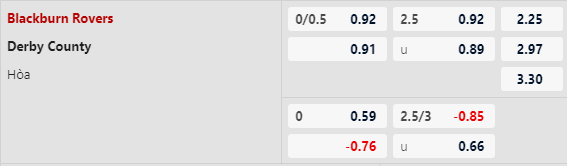 Thông tin tỷ lệ bóng đá Blackburn vs Derby County: