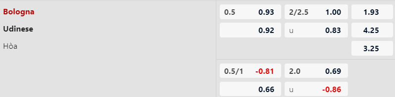 Thông tin tỷ lệ kèo Bologna vs Udinese: