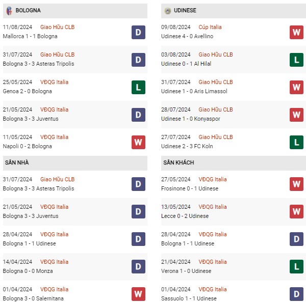 - Bologna thắng 2 thua 2 và hoà 6 trong 10 lần gần nhất đối đầu cùng Udinese.