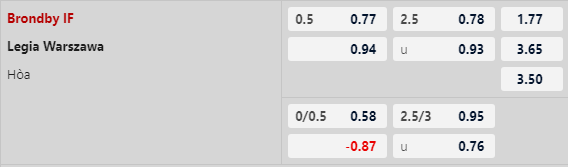Thông tin tỷ lệ kèo Brondby vs Legia Warszawa:
