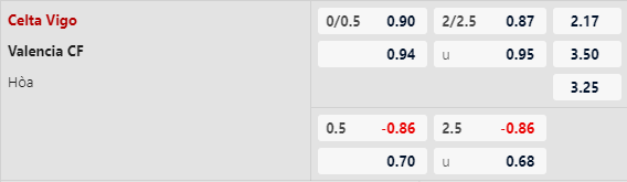 Thông tin tỷ lệ bóng đá Celta Vigo vs Valencia: