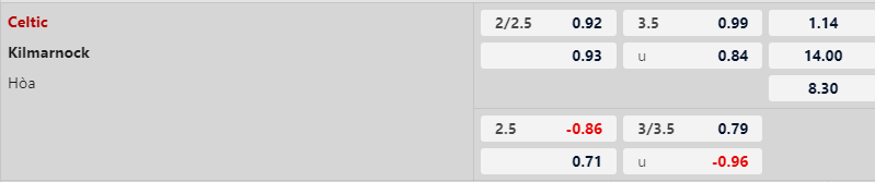 Việc Celtic sắm vai cửa trên không bất ngờ. Dù vậy, vừa thắng cả Man City lẫn Chelsea mà chấp Kilmarnock có 2 1/4 ở sân nhà cũng chẳng phải tỷ lệ gì “ghê gớm”. Celtic ở Scotland chẳng đáng tin về góc độ châu Á và nên nhớ cả 3 lần chấp 2 1/4 trên sân nhà mới nhất thì Celtic đều thua kèo.