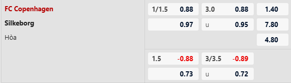 3 trận gần đây Copenhagen chấp 1 1/4 đến 1 1/2 trái như trận đấu này, đội chủ nhà đều để thua kèo châu Á. Với Silkeborg, trận gần nhất được chấp 1 1/4 trái, các cầu thủ khách đã xuất sắc cầm hòa ông lớn Nordsjaelland. Nếu tính cụ thể, Copenhagen chỉ thắng kèo 1/8 trận gần đây trên mọi đấu trường so với 9/12 trận vừa qua của Silkeborg.