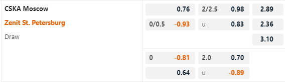Thông tin tỷ lệ CSKA Moscow vs Zenit: