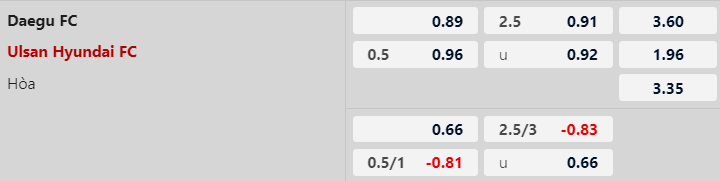 Với vị thế của nhà đương kim vô địch cùng sức mạnh và phong độ vượt trội, dĩ nhiên Ulsan HD sẽ là đội được xếp kèo trên ở cuộc đấu này. Mức chấp nhà cái châu Á đưa ra là -1/2 nghiêng về phía đội khách. 10 lần chạm mặt gần nhất, Ulsan HD đã đánh bại Daegu đến 7 lần và chỉ để thua đối thủ đúng 1 trận. Rõ ràng với bối cảnh hiện tại, không khó đê dự đoán về một chiến thắng tương đối dễ dàng dành cho các cầu thủ Ulsan HD.