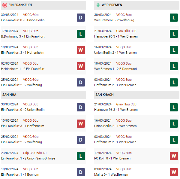 - Eintracht Frankfurt thắng 4, hòa 4, thua 2 trong 10 trận gặp Werder Bremen gần đây.
