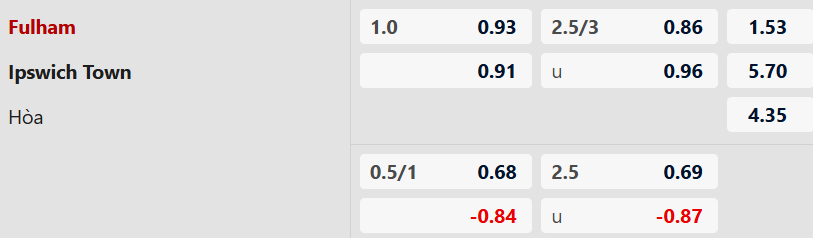 Thông tin tỷ lệ kèo Fulham vs Ipswich Town: