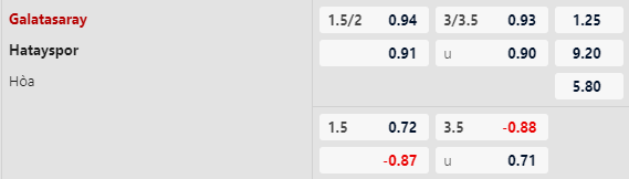 Được chơi trên sân nhà giúp Galatasaray được xếp ở chiếu trên. Tuy nhiên, kèo chấp khá sâu 1 3/4 tỏ ra chưa đáng tin khi họ để thua kèo châu Á 4/6 trận gần nhất. Ngược lại, Hatayspor cho thấy sự tin tưởng khi thắng kèo 4 trận liên tiếp vừa qua (tính cả mùa giải trước).