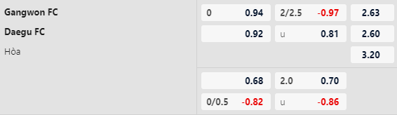 Thông tin tỷ lệ Gangwon vs Daegu: