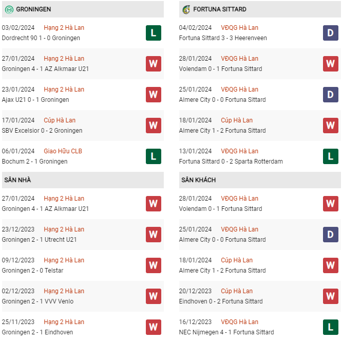 Thống kê phong độ Groningen vs Fortuna Sittard:
