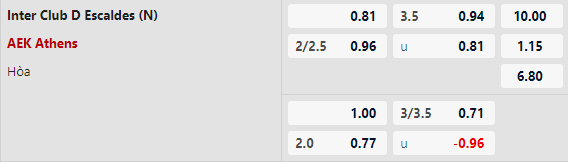 Thông tin tỷ lệ kèo Inter D'Escaldes vs AEK Athens: