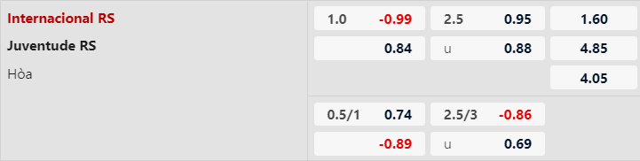Nhận định soi kèo Internacional vs Juventude, 05h30 ngày 15/8, vòng 6 VĐQG Brazil, sân Beira-Rio. Kèo châu Á đang để Internacional chấp 1 hòa là khá sâu, khi mà đội chủ nhà chưa thắng ở 12 trận đấu liên tiếp gần đây.