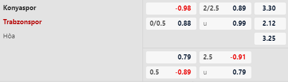 Thông tin tỷ lệ kèo Konyaspor vs Trabzonspor: