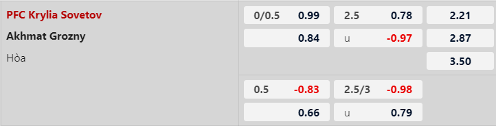 Cửa trên Krylia Sovetov không phải cái tên ưu tiên khi thua kèo ở vòng đấu vừa rồi còn Akhmat Groznyi thắng kèo cả 4 trận đấu mới nhất tại giải VĐQG Nga.