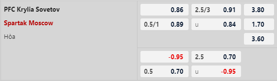 Thông tin tỷ lệ Krylya Sovetov vs Spartak Moscow: