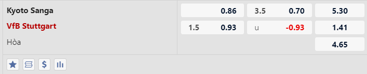 Kyoto Sanga thời điểm này ở giải VĐQG Nhật Bản đang đứng thứ 17 với 25 điểm. Họ chỉ hơn nhóm xuống hạng 1 điểm. Ở 6 trận được thống kê về kèo châu Á của Stuttgart thì họ thắng kèo 5 lần. Với đẳng cấp của đội bóng đang là đương kim Á quân Bundesliga, nhiều khả năng Stuttgart sẽ vượt kèo châu Á dù mức chấp đang là khá sâu.
