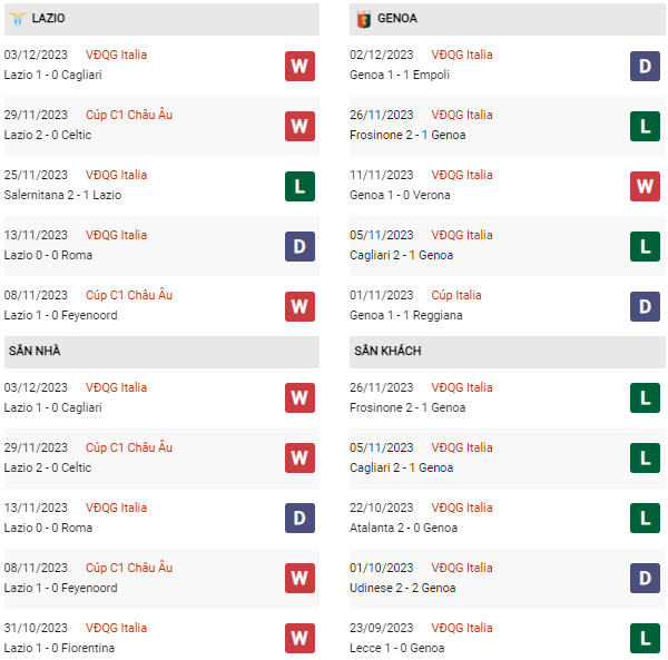 - 10 lần đụng độ chính thức gần đây, Lazio đã thắng 6, trong khi Genoa chỉ thắng 3.