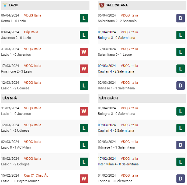 - Trên sân nhà, Lazio thắng 1, thua 1 trước Salernitana.