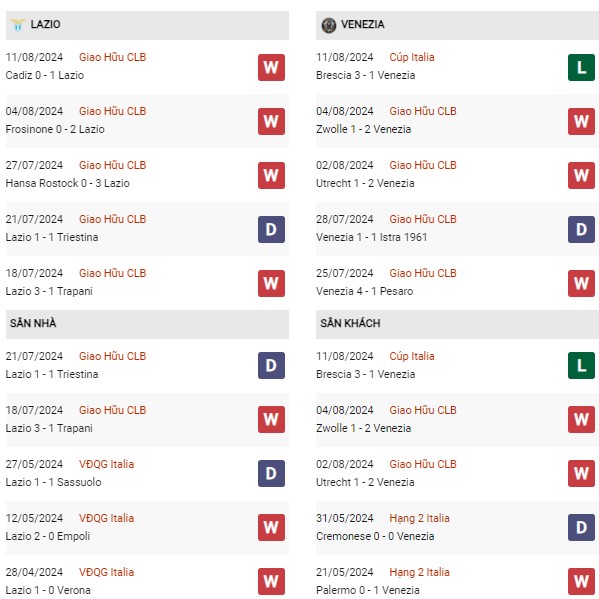Thành tích đối đầu Lazio vs Venezia: