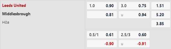 Thông tin tỷ lệ bóng đá Leeds United vs Middlesbrough: