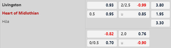 Không những đang khiến người hâm mộ lo lắng về viễn cảnh phải xuống hạng mà Livingston còn khiến các nhà đầu tư châu Á thua kèo tới 8, hòa kèo 1 trong tổng số 12 trận vừa qua. Trong khi đó, Hearts thi đấu khá ổn định khi thắng kèo tới 5, hòa kèo 2 và chỉ thua kèo 2 trong 9 lượt trận gần nhất. Với những con số thống kê này, nằm kèo đội khách với tỷ lệ chấp 1/2 trái sẽ là sự lựa chọn an toàn cho người chơi châu Á.