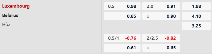 Có được ưu thế sân nhà cùng phong độ nhỉnh hơn, Luxembourg hoàn toàn xứng đáng là đội được đánh giá cao hơn với kèo chấp -1/2. 10 lần gặp nhau trong quá khứ, Luxembourg chỉ thắng 2 trận trong khi Belarus có đến 5 lần làm được điều tương tự. Tuy nhiên, nếu nhìn vào phong độ hiện tại của hai đội, sẽ không khó để dự đoán về một thắng lợi thuyết phục dành cho Luxembourg.