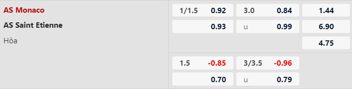 Monaco thắng kèo cả 3 trận đấu vừa rồi chạm mặt Saint-Etienne và đó là những trận đấu có tỷ số thắng cách biệt. Monaco thắng kèo tới 10 trong số 12 trận đấu chính thức vừa rồi có cược chấp. Trong khi đó, Saint-Etienne không thắng kèo 6/9 trận đấu mới nhất trên sàn giao dịch châu Á.