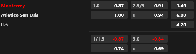 Thông tin tỷ lệ Monterrey vs Atletico San Luis: