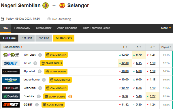 Thông tin tỷ lệ Negeri Sembilan vs Selangor: