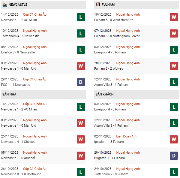 - 10 lần đụng độ gần đây, Newcastle đã thắng 5, trong khi Fulham chỉ thắng 3.