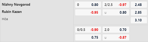 Thông tin tỷ lệ kèo Nizhny Novgorod vs Rubin Kazan: