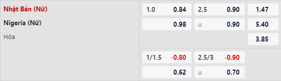 Nữ Nhật Bản được đánh giá cao hơn nhiều với kèo chấp 1 hòa theo handicap. Nữ Nigeria chưa bao giờ là đối thủ của Nữ Nhật Bản. Theo thống kê, Nữ Nhật Bản có đến 3 chiến thắng trước Nữ Nigeria, trong khi chỉ thua 1 trận.