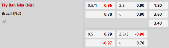 Thông tin tỷ lệ Nữ Tây Ban Nha vs Nữ Brazil: