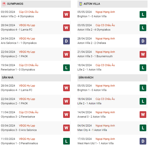 Thống kê phong độ Olympiacos vs Aston Villa: