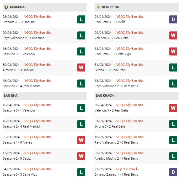 Osasuna lại đang có phong độ không tốt với 3 vòng liên tiếp thất bại. Sở dĩ có điều đó vì đội bóng này thực tế xác định an toàn và không có mục tiêu. Phía đối diện thì Betis chơi ổn với 2 chiến thắng cùng 1 trận hòa ở 3 vòng vừa qua.