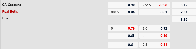 Thông tin tỷ lệ kèo Osasuna vs Betis: